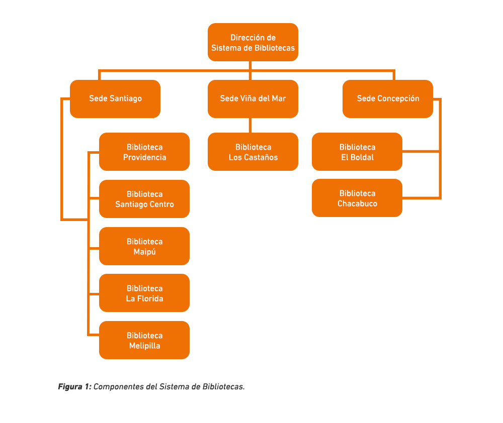 El Sistema de Bibliotecas UDLA está compuesto por ocho bibliotecas distribuidas en tres sedes: Santiago, Viña del Mar y Concepción (ver figura 1). La Dirección de Bibliotecas se ubica geográficamente en el Campus Providencia, y es responsable de coordinar en forma funcional a las bibliotecas, para lograr que todas brinden los mismos servicios y productos a los usuarios.