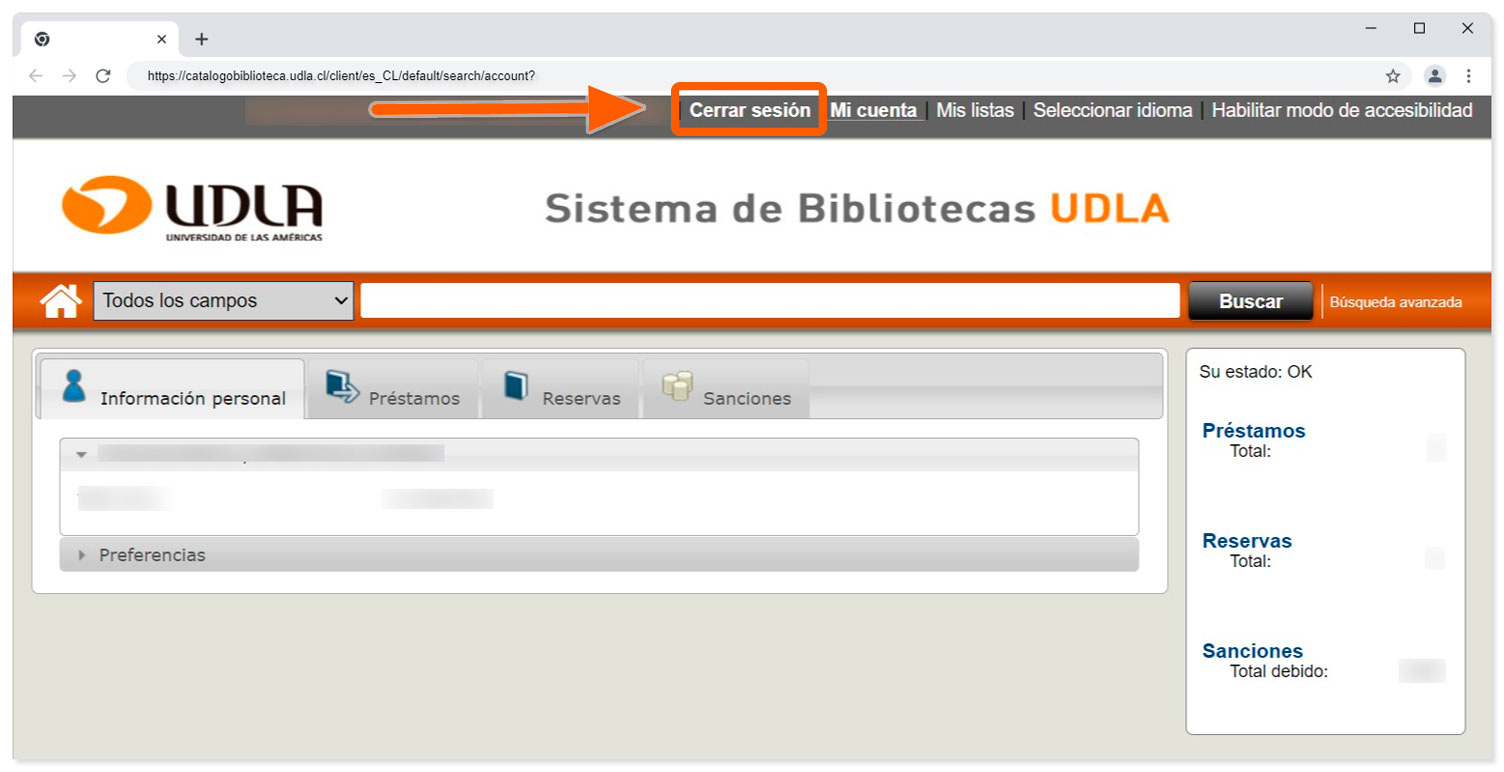 e) Una vez que haya renovado los libros seleccionados, se mostrará la nueva fecha de devolución. Al finalizar, recuerde cerrar su sesión en la barra superior: