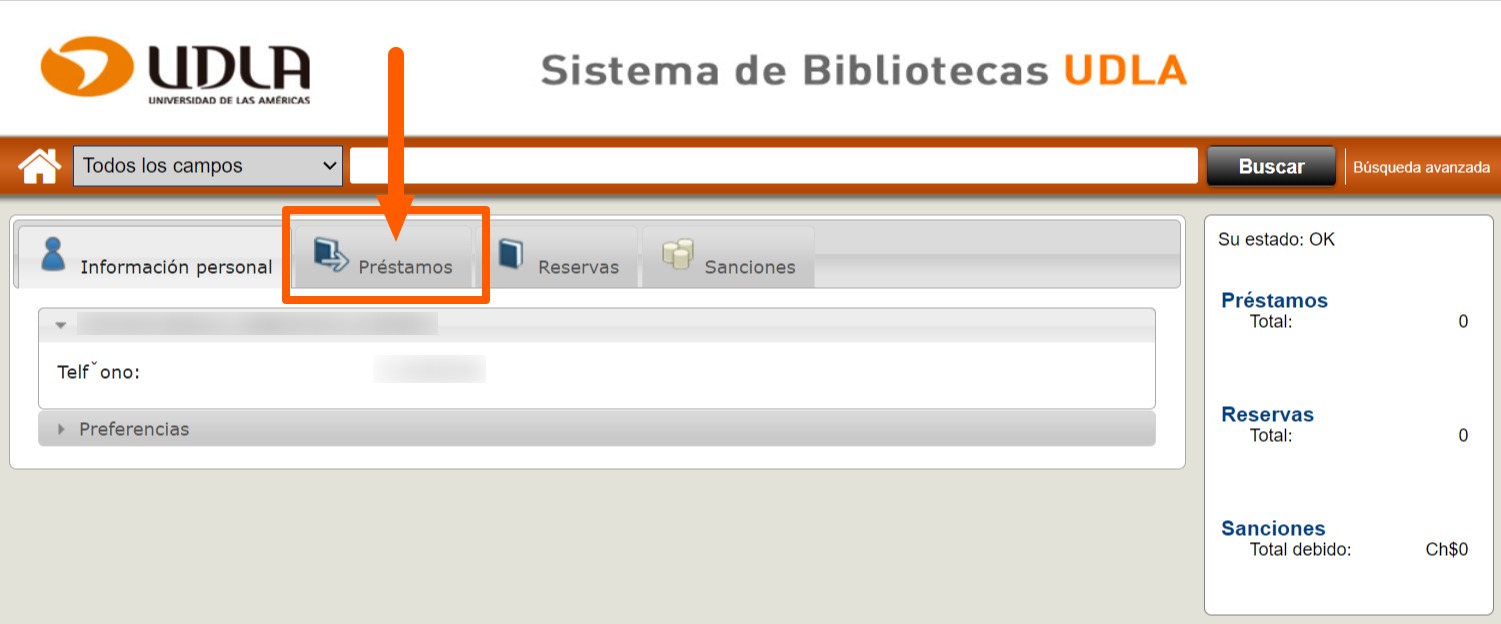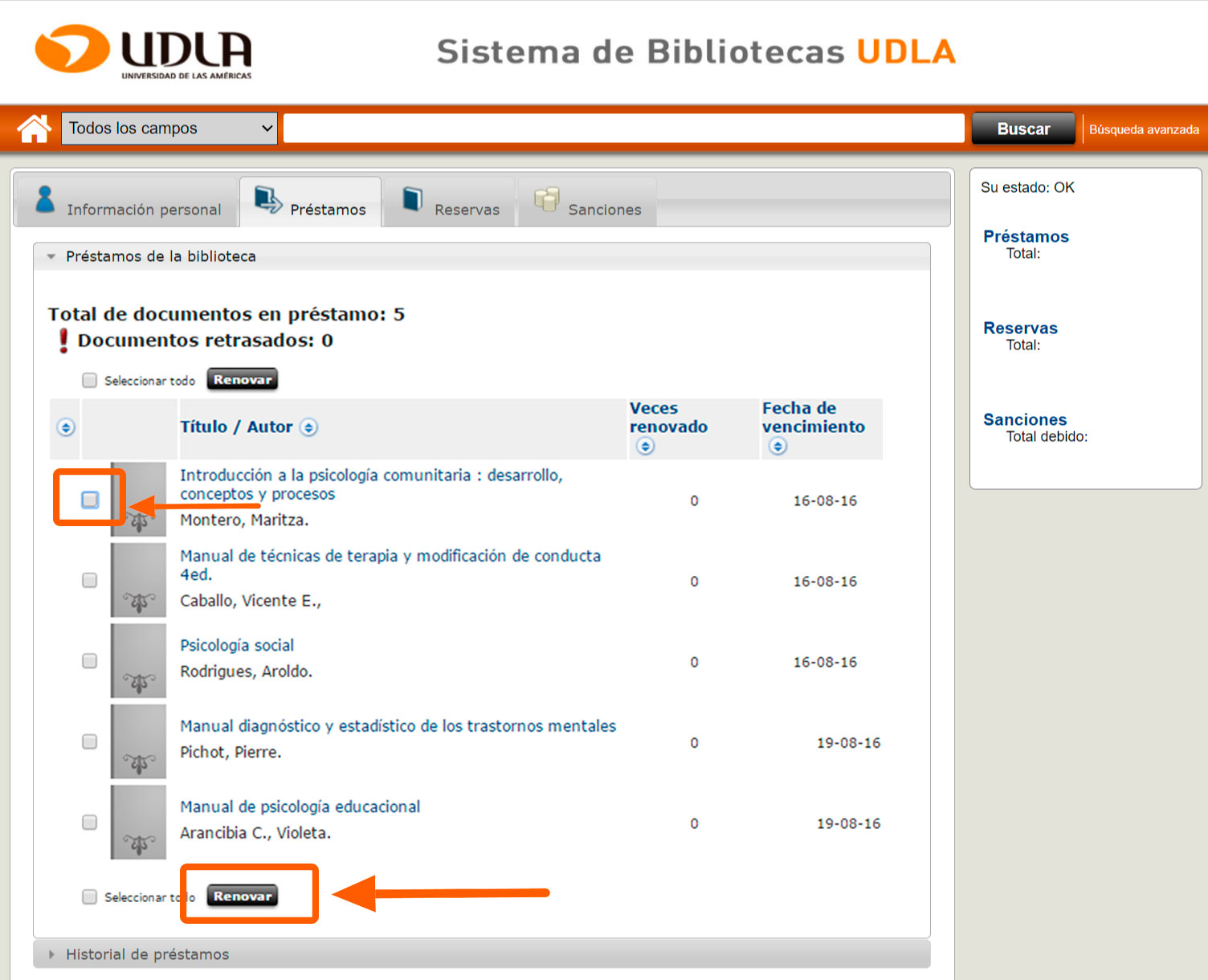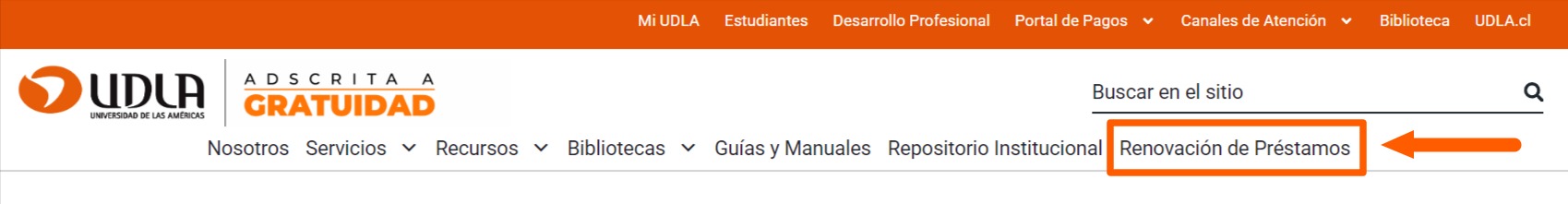 a) Ingrese a «Renovación de Préstamos» en la barra superior del portal de biblioteca: